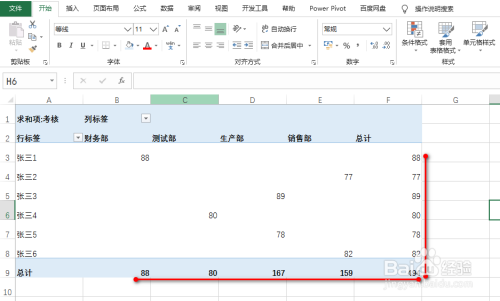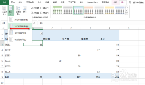 点中透视表中肆意一个单位格,并在“设计”选项卡下点击“总计”下的“对行和列启用”,具体如图所示: