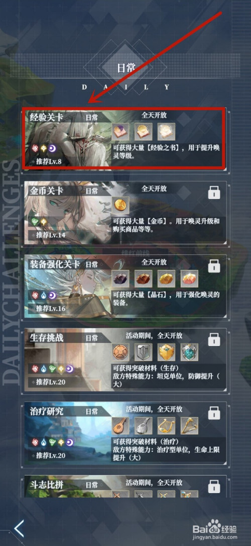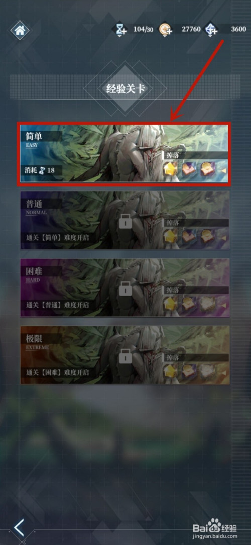 四.之后再点击【经验关卡】,进入到关卡的难度选择界面中。