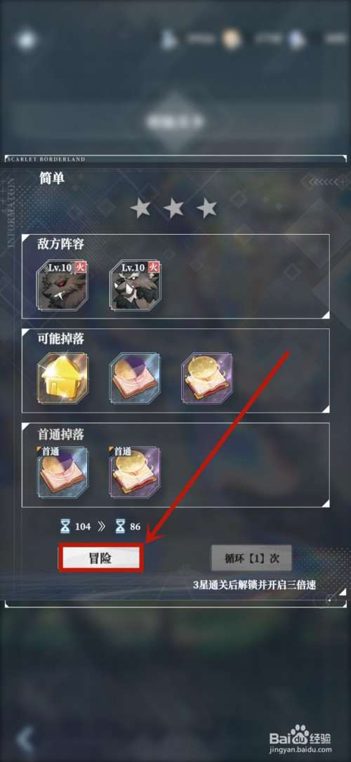 六.最后只需要点击【冒险】就可以当作功获得经验材料了。