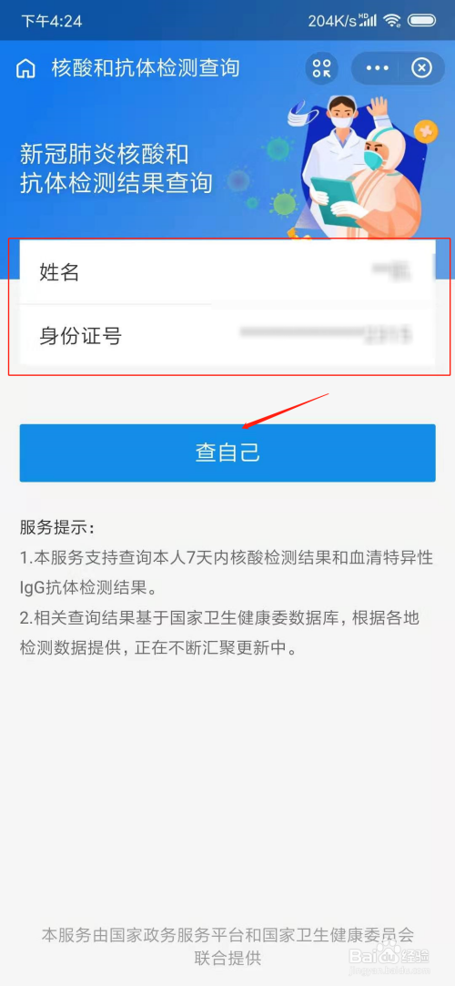 输入本身的名字和身份证号码,然后点击下方的查本身按钮。