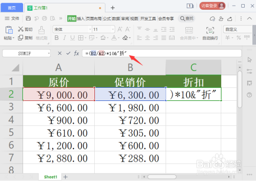 我们在编纂栏中输入【=(B2/A2)*10&"折"】,如图所示。
