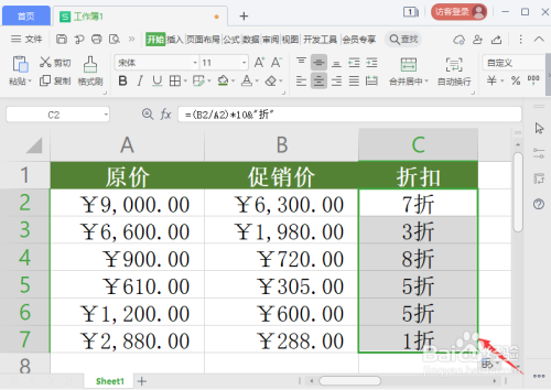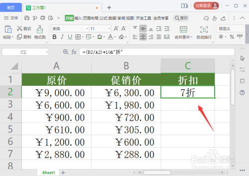 接着,我们按下回车确定,可以看到C2单位格计较出来的扣头为7折,如图所示。