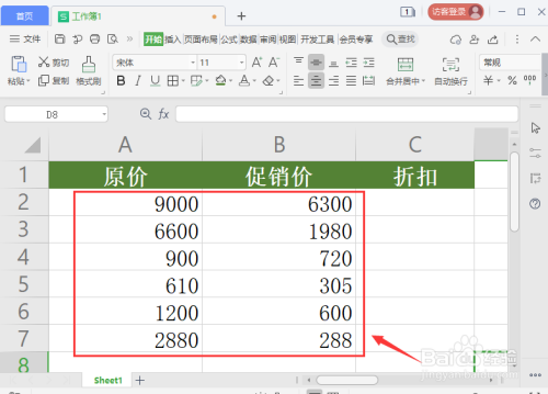 我们在表格的A列和B列单位格中输入价钱,如图所示。
