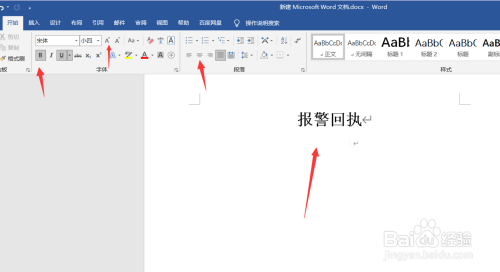 打开文档写入题目“报警回执”加粗、加大、居中。