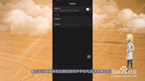 5、最后封闭跟从系统后面的按钮并手动勾选深色模式即可。