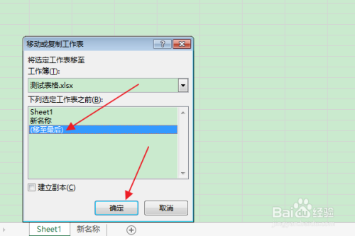 在弹出对话框中,在“下列选定工作表之前”列表中,选择“(移至最后)”,点击确定。