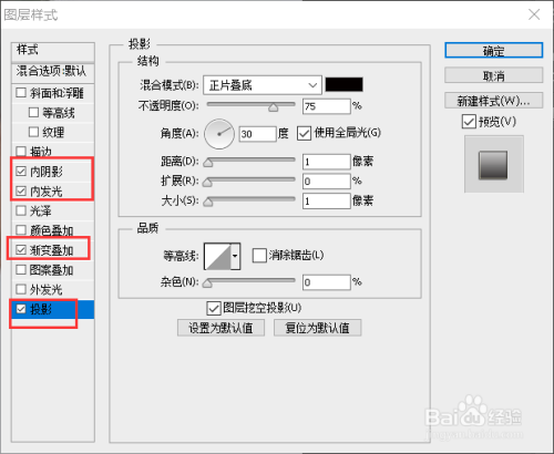 将内暗影、内发光、渐变叠加、投影都勾选。