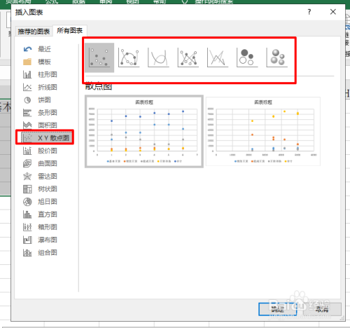 单击【X Y散点图】,右侧单击选择散点图样式,设置完当作后点【确定】。