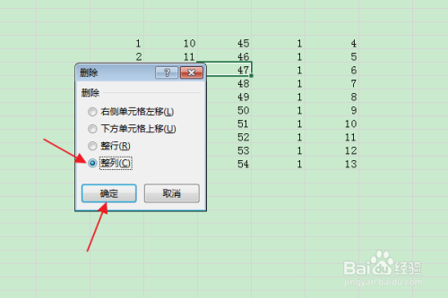 在弹出“删除”窗口中,勾选“整列”,点击确定。