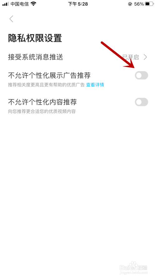 跳转新页面后,查找并点击“不许可个性化展示告白保举”右侧按钮。