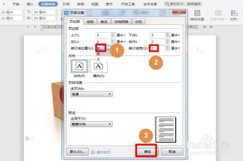 在当前“页边距”的界面,我们可以看到“装订线位置”可以设置在左边或上边,这里选择“左”,然后再设置装订线宽度,好比为2厘米,最后点击底下的“确定”。