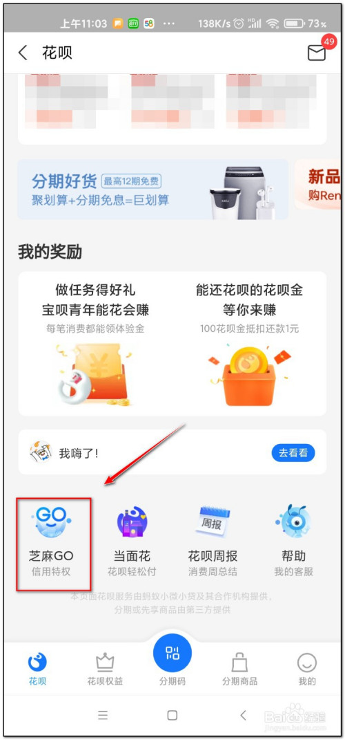 滑动花呗界面底端,点击”芝麻GO“