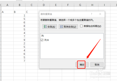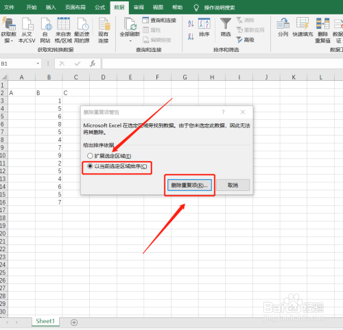 勾选第二个“以当前选定区域排序”,点击删除反复值。
