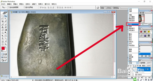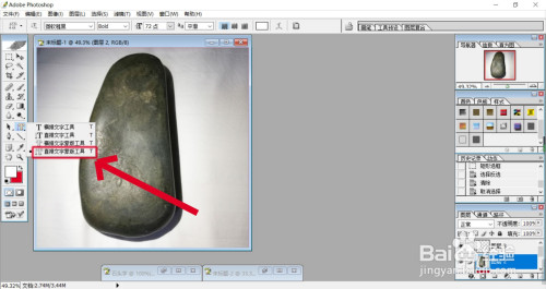 导入一张石头的图片作为素材,我们点击文字东西下拉菜单中的直排文字蒙版东西。