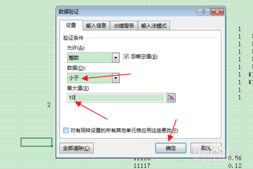 在“数据”下拉框中选择“小于”,在“最大值”框中输入所需的数字(好比:10),点击确定。