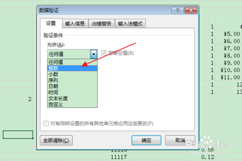 在弹出的“数据验证”对话框中,在“许可”下拉框中选择“整数”。