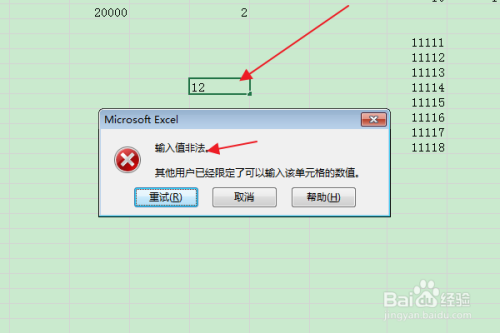 返回编纂区,在选中单位格中输入最大值以上的数字时,会有错误提醒,申明最大值设置当作功。