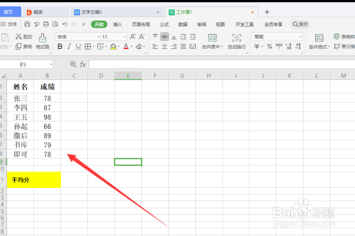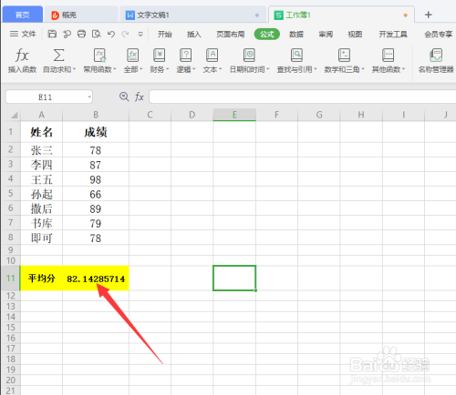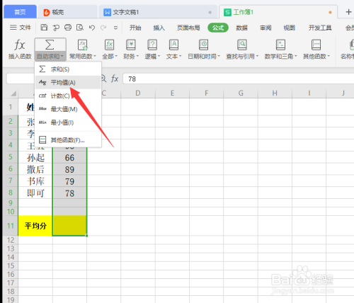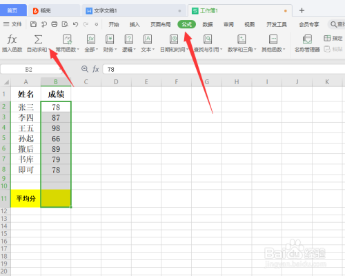 选中成就栏,下拉到设置的平均分行;点击公式——主动乞降.
