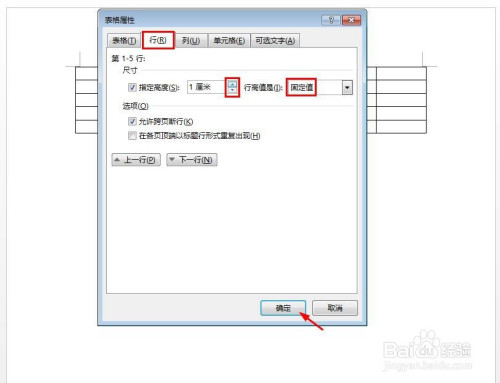 第五步:切换至“行”标签页,在行高值处选择“固定值”,单击指定高度后面的小三角,将行高调整当作本身需要的大小,单击“确定”按钮。