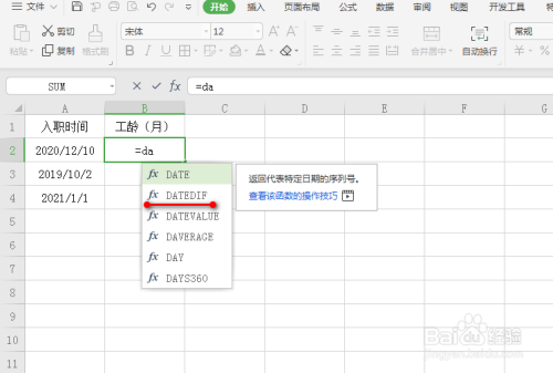 在一空白单位格中,输入关头字并找到函数datedif,具体如图所示: