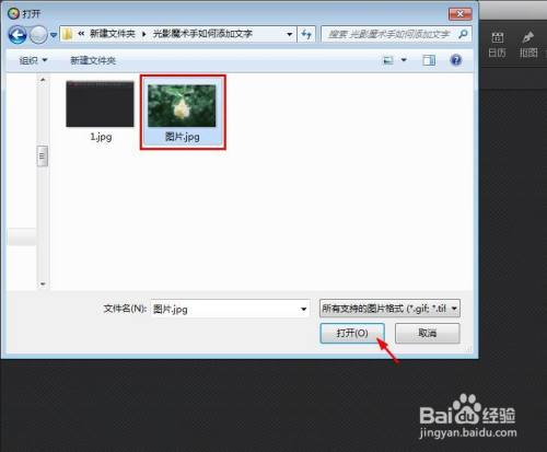 第二步:在弹出的打开对话框中,选中一张需要添加文字的图片,单击“打开”按钮。