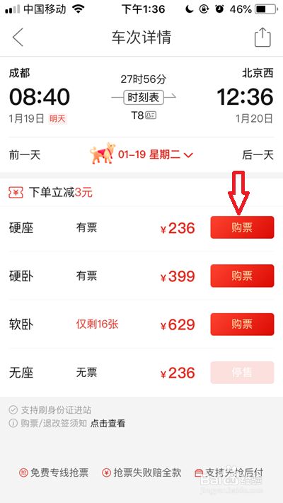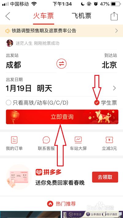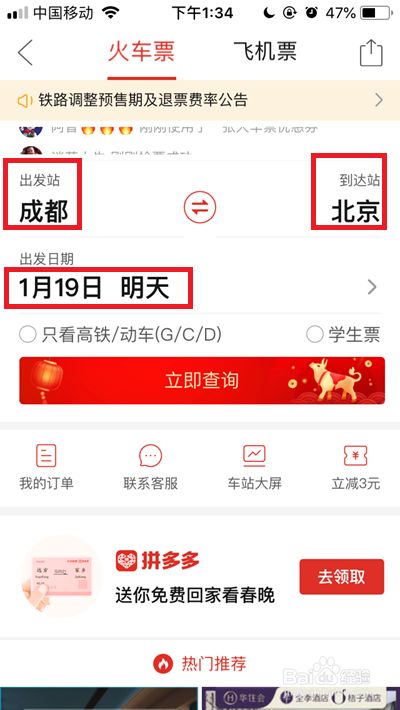 然后进入到了火车票查询页面,我们按照本身的需求选摘要采办的火车票出发站、达到站,以及出发日期