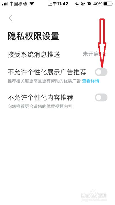 将【不许可个性化展示告白保举】右侧的开关按钮点击开启。