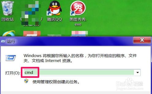 方式:打开“运行”程序,输入cmd号令,确定。