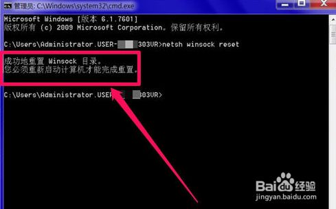 进入号令提醒符窗口后,输入netsh winsock reset号令,回车,这个是重置Winsock号令。