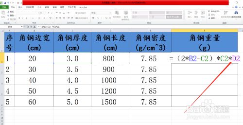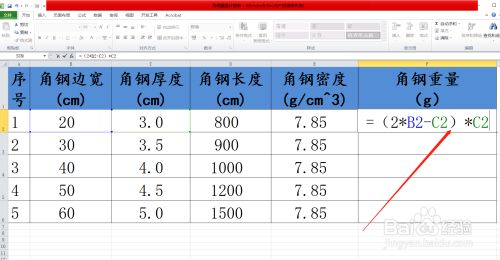 第5步:接着乘以角钢密度,计较出角钢的重量,即输入公式“*E2”。