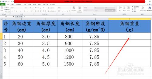 第2步:在角钢重量一栏单位格,输入公式“=”。