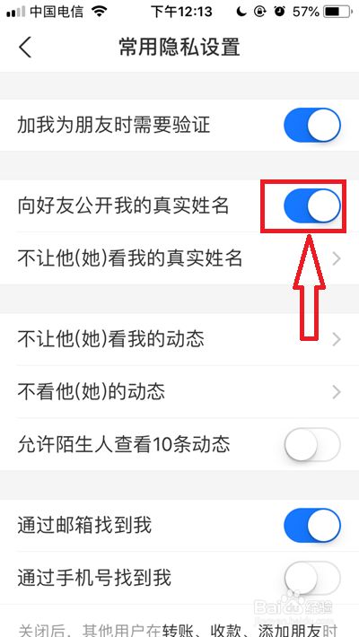 将【标的目的老友公开我的真实姓名】右侧的开关按钮点击封闭