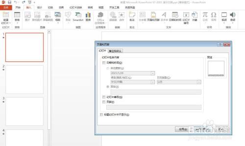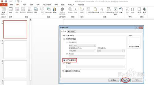 第四步:在“页眉和页脚”对话框中的“幻灯片”标签页下,勾选上“幻灯片编号”,并单击“全数应用”按钮。