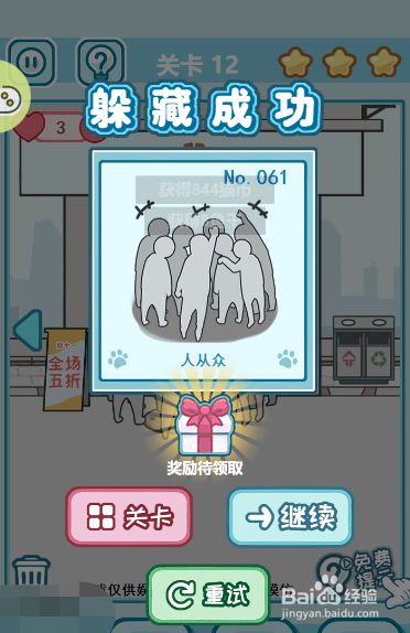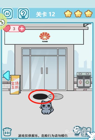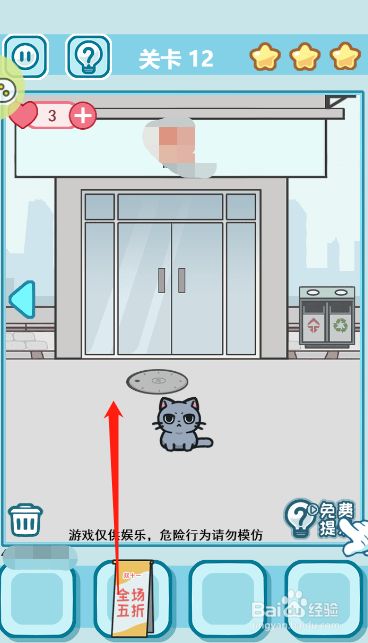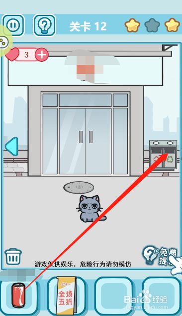 方式/步骤1首先切换到左边的场景点击获得地上面的易拉罐瓶和藏在右上角的星星2然后点击拿走地上的打折牌,这时辰大师就会散开,店肆里面会呈现一颗星星3接着切换回中心的场景而且把易拉罐扔到垃圾桶里面,这样子我们就会获得一颗星星4然后把打折的牌子放到图示的位置就可以在躲藏之后吸引来人潮5最后打开下水道的井盖而且躲藏进去6这样子就可以顺遂过关了END