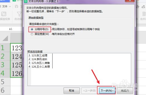 在排列窗口,点击“分隔符号”,再点击“下一步”。