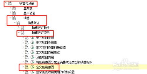 点击'发卖与分销',睁开子项,选择'发卖' —>'发卖凭证' —>'发卖凭证项目' —>'界说拒绝原因',点击执行