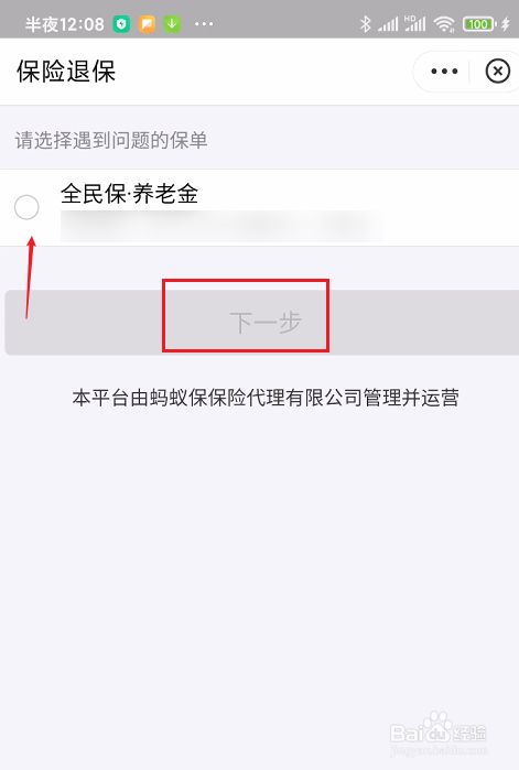 在保险退保页面中,勾选全民调养老金,再点击下一步,我们就可以退保了。