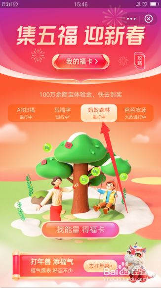 集五福的体例有四种,任选一种,例如蚂蚁丛林集五福,点击进入。