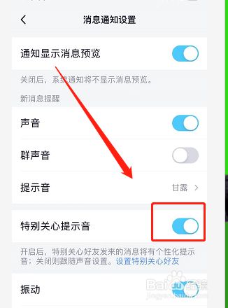 进入新界面点击【出格关心提醒音】右侧的灰色按钮,如图;