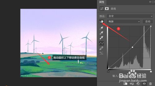 在属性文本框中点击直方图左侧的设置白场的吸督工具—>吸收图片的颜色作为白场边界,调整图片曲线