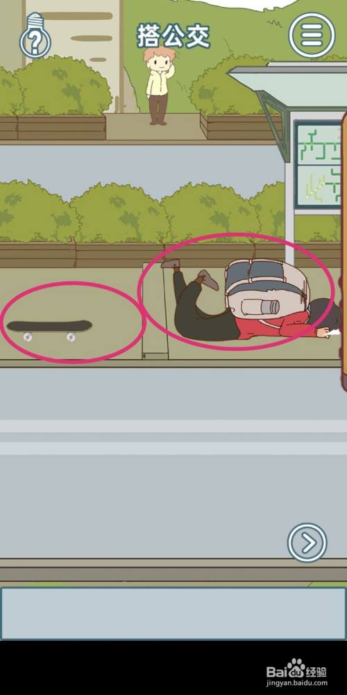 【弥补终局】点击拖动【滑板】给本家儿角去赶公交,本家儿角就会滑到,游戏掉败。