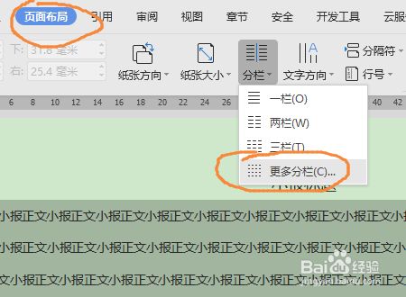 然后在该界面中,选中小报正文,点击上方的“页面结构”里“分栏”的“更多分栏”选项。