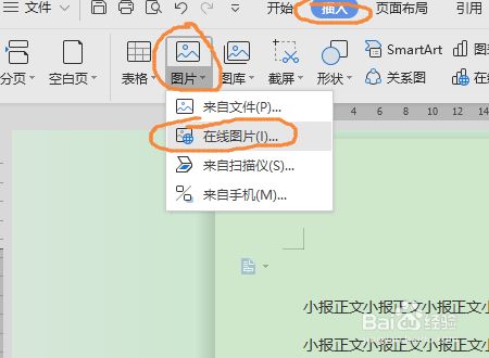 再者在新文档界面中,点击上方东西栏里“插入”里“图片”的“在线图片”选项。