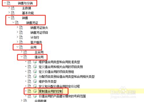 点击'发卖与分销',睁开子项,选择'发卖' —>'发卖凭证' —>'合同' —>'值合同' —>'复制值合同的节制' ,点击执行