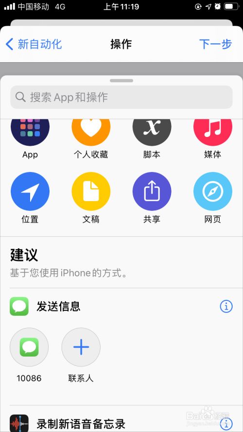 首先我们的思绪是拟定一个主动化的流程来启动发送短信这个功能,所以我们需要操纵我们的快捷指令app