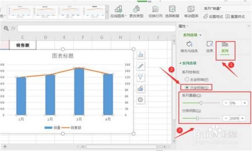 最后,切换到【系列】页面,选择【次坐标轴】,将【系列重叠】数值设置为0,【分类间距】设置为“200%”即可: