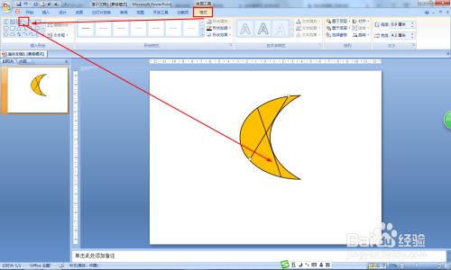 点击插入——外形——选择新月形,画一个新月形——在格局中填充黄色。
