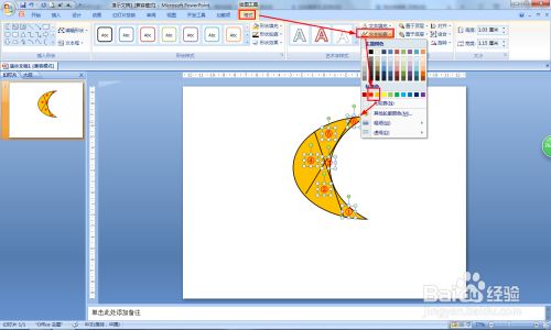最后选择所有的序号——点击格局——文本轮廓,设置为红色,这样就很较着看出两条直线把新月分当作六部门。
