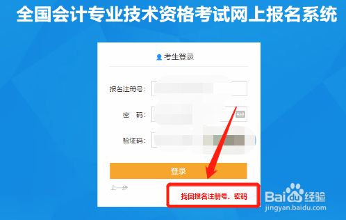 在登录页面点击下方的找回报名注册号、密码。