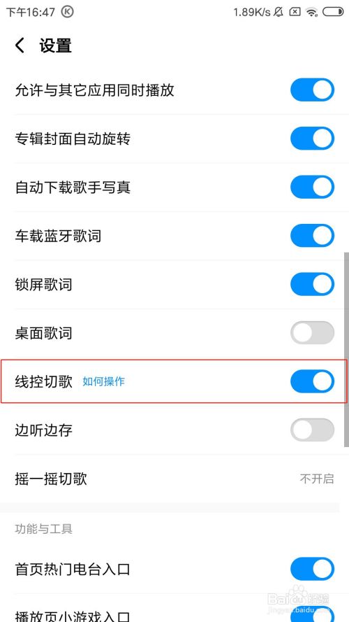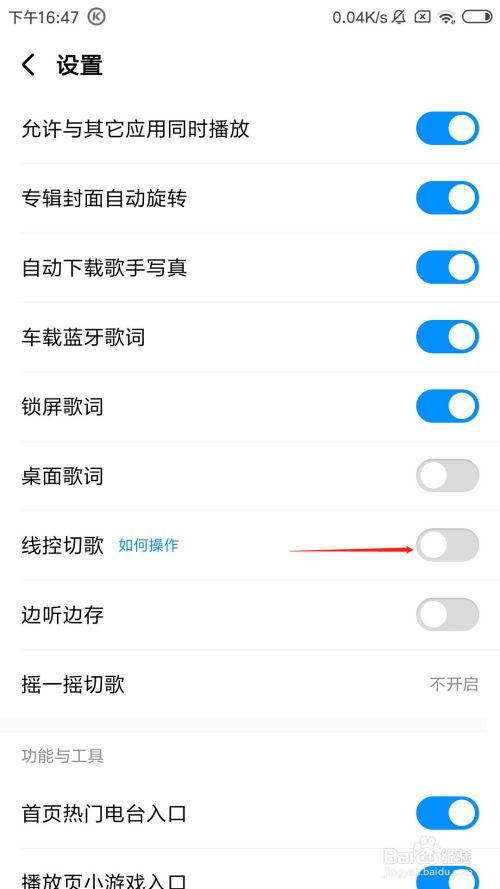 在设置页面中,点击线控切歌后面的开关。